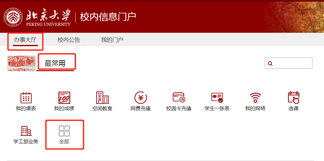 (1)请登录portal.pku.edu.cn网站,凭校园账号进入个人门户,在“最常用”列表下点击“全部”;