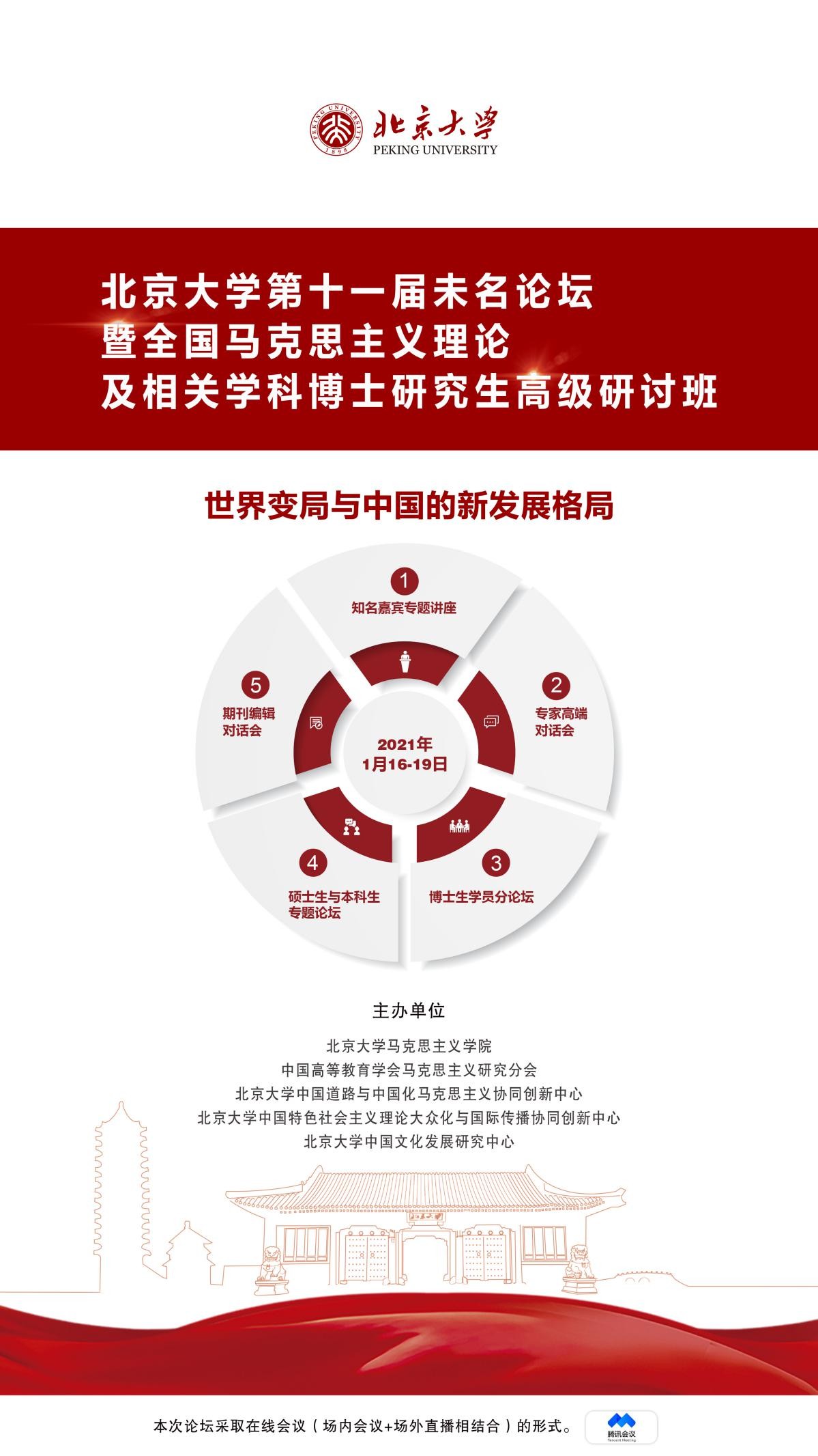 77779193永利官网第十一届未名论坛暨全国马克思主义理论及相关学科博士研究生高级研讨班拟于2021年1月16-19日隆重召开,本届论坛主题是“世界变局与中国的新发展格局”。研讨班将邀请国内著名专家授课、讲解,组织多种形式的论坛、沙龙、演讲。论坛以博士生为主,并设有硕士生和本科生的专题论坛。诚邀全国马克思主义理论学科及经济学、政治学、历史学、社会学、哲学等相关学科博士研究生“云”相聚于百廿燕园,共同审视世界百年未有之大变局,共话中国发展新阶段、新格局、新征程,共商、共建、共享具有中国气派的21世纪马克思主义理论。