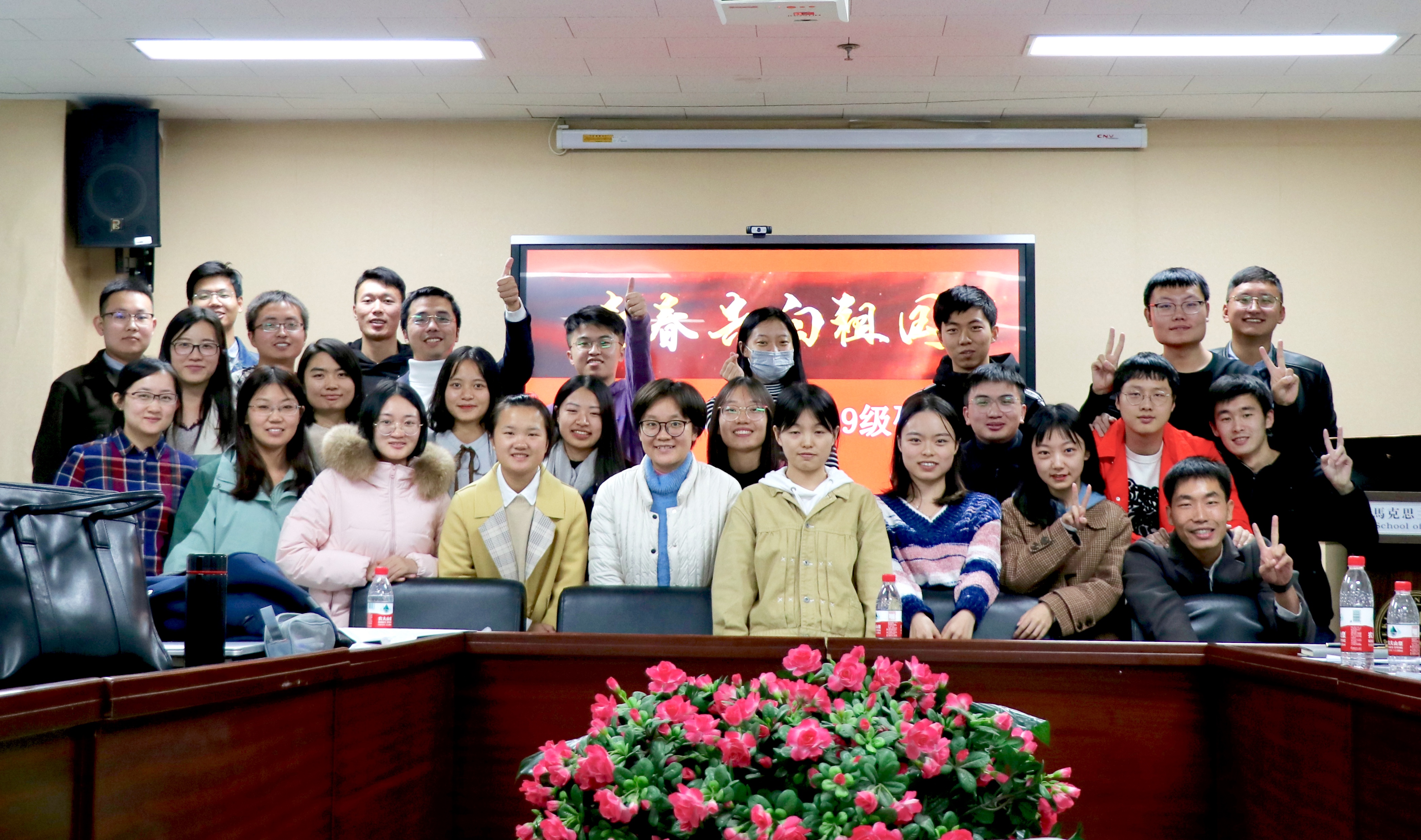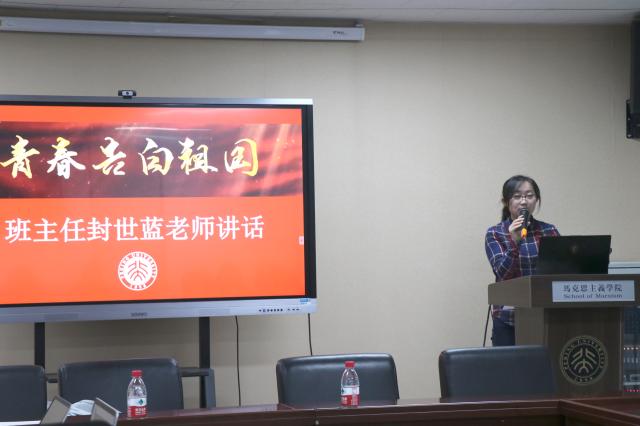班主任封世蓝老师从观看国庆70周年庆典的感受出发,鼓励同学们坚守北大师生“凝心铸魂”方阵所彰显的精神内涵。接着以我国社会发展的具体数据为基础,直观地向大家展示了新中国成立70年来取得的伟大成就。结合今年诺贝尔经济学奖授予反贫困经济学家的时事新闻,介绍了我国在扶贫工作上为人类历史做出的巨大贡献。最后,封老师希望同学们牢记习近平总书记“勤学、修德、明辨、笃实”和“爱国、励志、求真、力行”的嘱托,不断提高自身的学术理论修养,努力用青年话语回应青年关切的时代问题,促进马克思主义在新时代的传播。