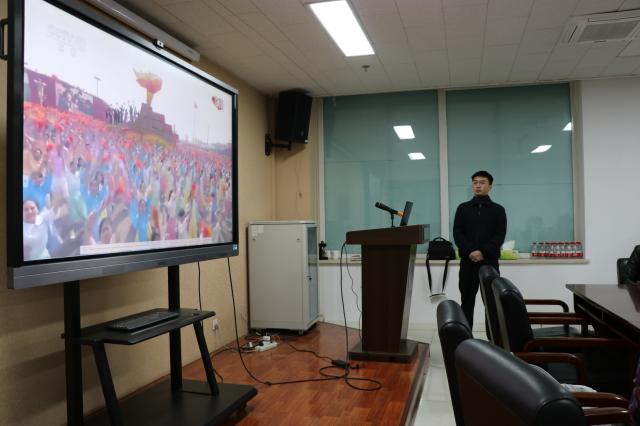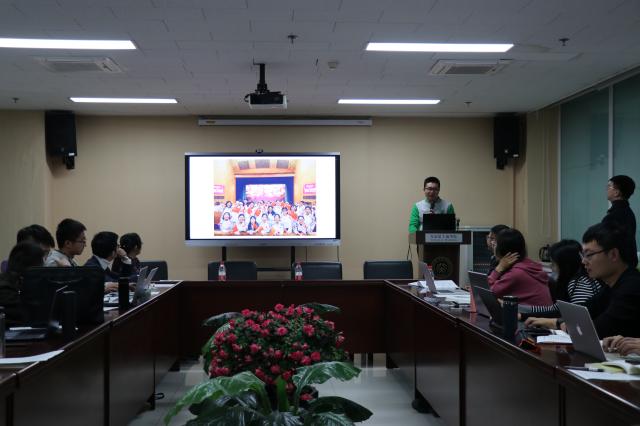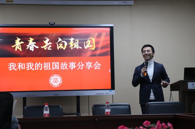 同学们听了封老师的讲话后备受触动。大屏幕也播放了国庆游行中由北大师生组成的“凝心铸魂”方阵通过天安门前的视频,让同学们回味了国庆那天激动的心情。随后,参与了国庆游行活动的杨胜博、庞瑞翰两位师兄和大家分享了他们参加重大活动的感想。