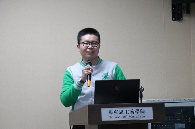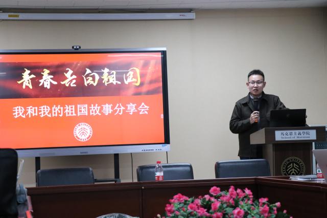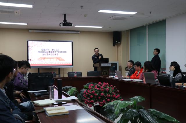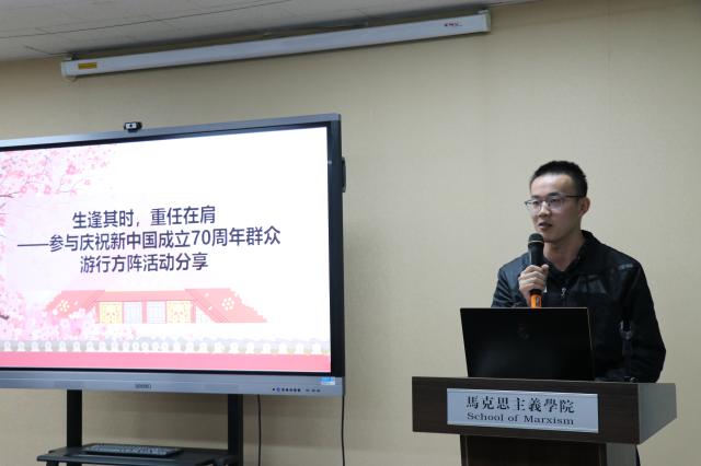 杨胜博师兄集中分享了这次国庆活动中,师生们的幕后付出。艰苦的训练、繁忙的日程、严格的要求不但没有让参与重大活动的师生退却,反而让大家紧紧团结在一起,越战越勇。马院师生在整个团队中发挥了良好的作用,从不懈怠,许多师生担当起了排头兵的重任,还负责起了宣传、文艺等工作、活动。国庆当天,“团结起来,振兴中华”的口号响彻长安街,即便已经走过天安门,大家也没有停下呼喊。这个口号将一直喊下去,不会停歇!