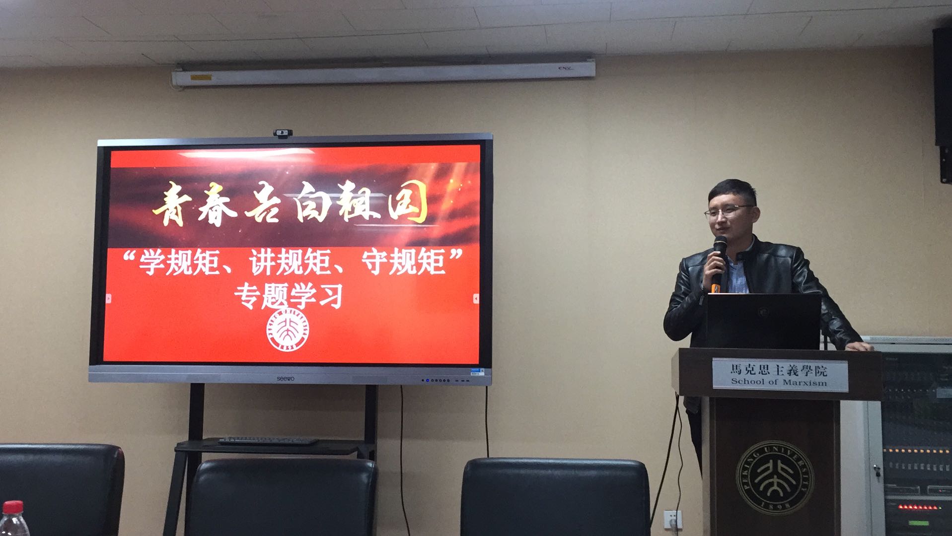 班会的第二部分,团委书记老师向同学们作了关于“学规矩、讲规矩、守规矩”的专题授课。罗老师从多个方面,结合具体事例,强调规矩的重要性,要求大家牢树底线意识,时刻遵守法律法规和校纪校规,同时大家也要注意保护好自己的人身、财产安全,遇到问题要及时和学院沟通。