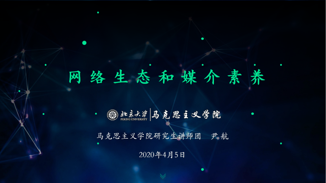 尹航同学的宣讲题目是《网络生态和媒介素养》。他首先从自然生物圈的概念出发,引申出网络生态的概念,并指出这两个领域的区别和联系;随后介绍了媒介素养由媒介使用素养、信息处理素养和社会参与素养组成,提出媒介素养是参与网络生活的生存手段。之后,尹航同学介绍了当今网络时代的“后真相”和“娱乐至死”的特点以及中国互联网使用状况,希望同学们在理性对待网络信息中形成自己的媒介素养,在网络生活中做思想者、责任人和守法者;最后,结合本次疫情期间的舆论,他希望同学们能够深入思考每一次舆论事件背后的社会、政治因素,进一步提升自己的媒介素养。