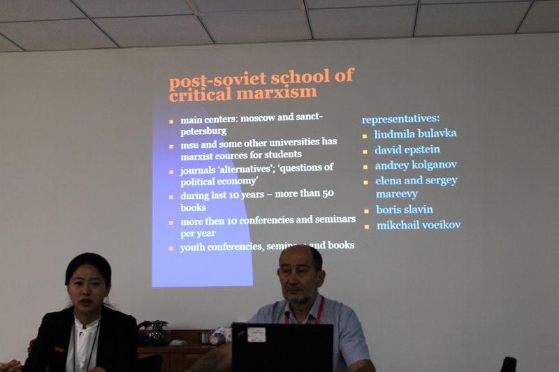 布兹加林教授首先介绍了后苏俄时代马克思主义的主要趋势,认为当前俄国存在苏联模式的马克思主义、西方模式的社会民主主义、后苏联批判马克思主义学派等主要趋势。俄国马克思主义者存在代沟,60岁以上居多而30岁以下较少,他们还得不到国家支持,有时受到来自政府的压力。因此,当前俄国马克思主义者相对比较困难。俄国从社会主义走向了资本主义,说明社会主义的发展并不是一种直线,而往往是一条曲线,要经历曲折的过程。随后,他还提出了货币和资本的新特质,认为货币出现虚拟化的趋势,主要不是以货币形式出现,而是存在于虚拟的网络中。资本的剥削也出现了新的形式,同工不同酬、贸易剪刀差等问题严重,他还以电脑生产的大部分利益被微软等公司抽取的例子说明利润并不真正属于财富的创造者。而且资本依旧存在全球霸权,许多国家看似发达,实际上依旧受美国资本操控,不像中国,俄国等很多国家受原油价格影响巨大,虽然国家可以制定计划,一旦原油价格下降,计划就会受到严重影响。