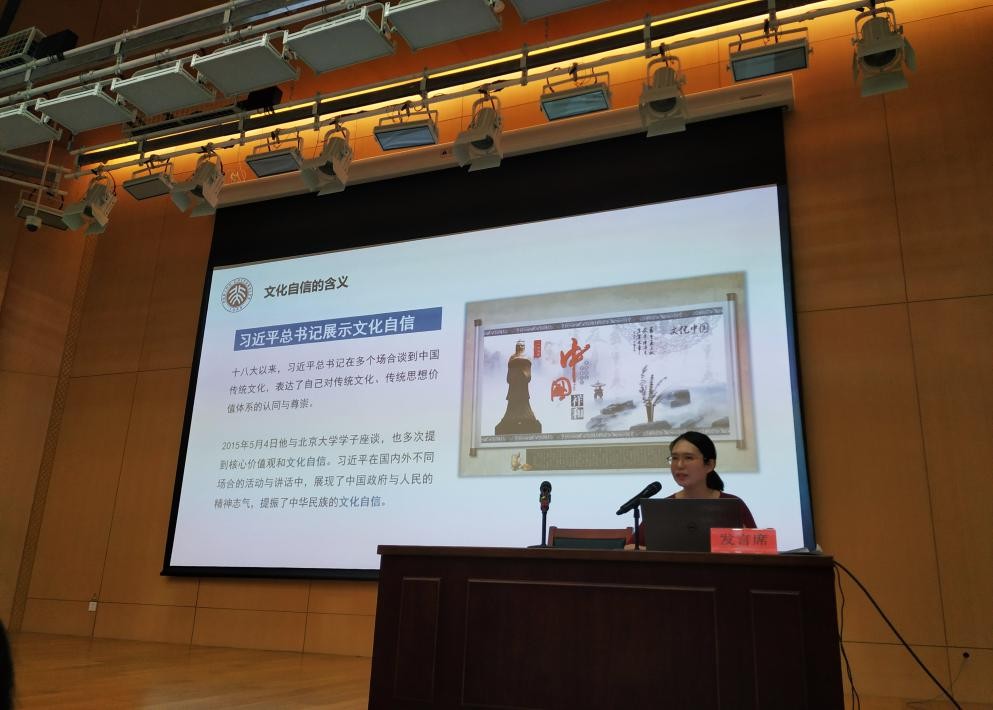 思想政治教育专业2018级博士生张夏蕊分享的题目是《坚定文化自信 担当文化使命》。张夏蕊从中国优秀传统文化、中国共产党革命文化和社会主义先进文化入手,分析了文化自信的内涵、文化自信得以建立的文化和历史基础、以及树立文化自信对于个人成功和中华民族伟大复兴的实现所具有的重要意义。