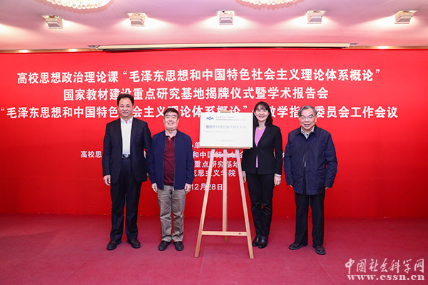 陈矛、于鸿君、顾海良、陈占安共同为高校思政课“毛泽东思想和中国特色社会主义理论体系概论”国家教材建设重点研究基地揭牌。