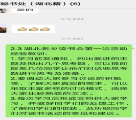 湖北籍同学人自己也组织了起来,同学们建立了微信群,在群里组织些读书、学习。为了更好服务同学们的读书活动,周泉、陈婷、黄敏、杨玉文、彭逸飞等几位同学还组成了秘书处,就读书活动积极谋划、组织,提供书目,搜集资料,协调读书讨论时间,整理讨论成果等。大家以昂扬的精神状态投入到学习和战疫之中,做到战疫期间不误学业,积极服从和配合学校和学院的相关工作安排。