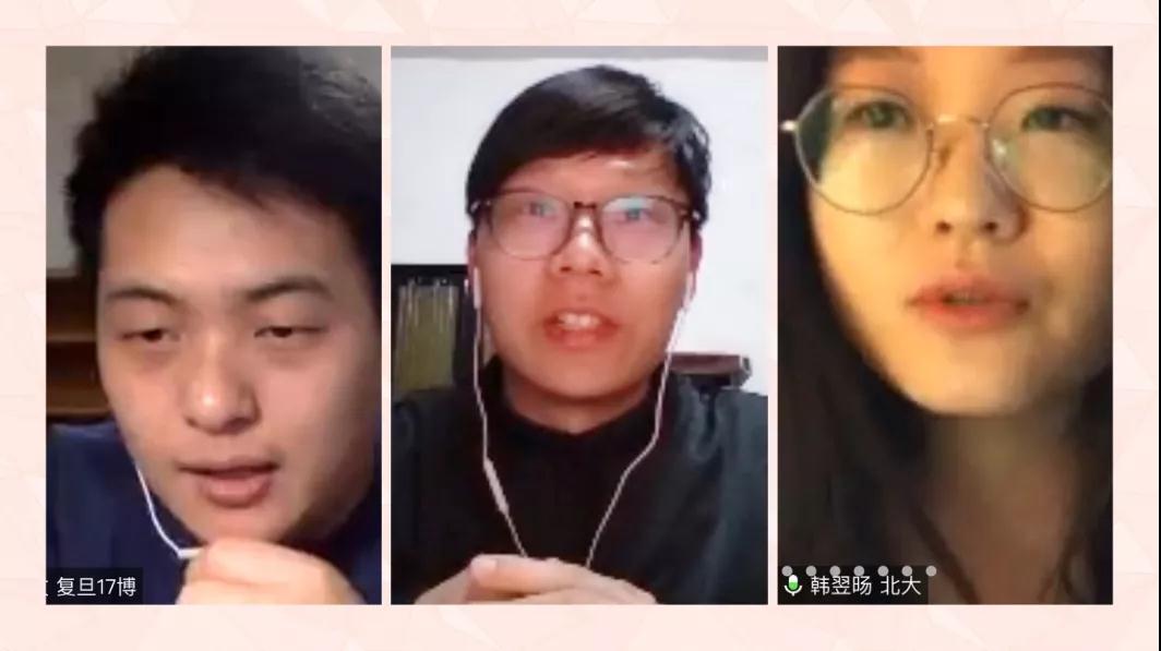 交流会首先由三校马院学生代表简要介绍学院基本情况、防疫措施以及抗疫故事。复旦马院博士生严哲文作为应届毕业生和党支书,分享了特殊时期同学们在论文写作与求职中互帮互助的经验。武大马院硕士生项元顺介绍了疫情期间,学院导师开展防控网络调查与积极传播正能量的事例。北大马院硕士生韩翌旸介绍了学院老师帮助同学们寄送学习资料、为湖北籍学生寄送防疫物资等工作,分享了自己参加无偿献血、阿拉伯语翻译等志愿服务活动的经历。