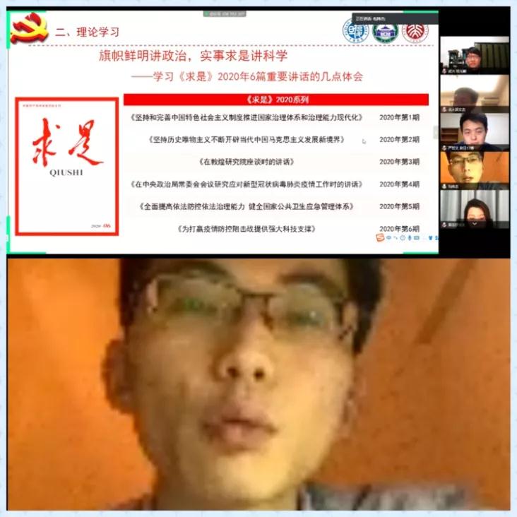 武大马院王翔同学从经济资助、心理辅导、医疗服务和建构信息平台四个方面介绍了学校在疫情期间的贴心举措。复旦马院章慧、石钻佳同学分享了建立毕业论文互助群和求职信息群的成功经验,鼓励大家保持持积极心态,清楚需求不盲从;陆婷婷、许镇峰同学分别解答了论文选题撰写技巧与支部创新性问题。随后,武大马院方蕾同学讲述了自己在黄冈参与防疫志愿工作的经历。北大马院杨胜博、彭逸飞、葛玲玲和杨玉文同学交流了居家学习期间调节心态的体会以及和导师的交流心得,号召同学们坚定信心,科学规划时间,沉下心来阅读经典。武大马院寇静同学鼓励大家加强锻炼、多和家人沟通。复旦马院董扣艳同学介绍了博士生学术工作坊、望道读书会、“小马过河”等学院特色活动,邀请大家一同参与。