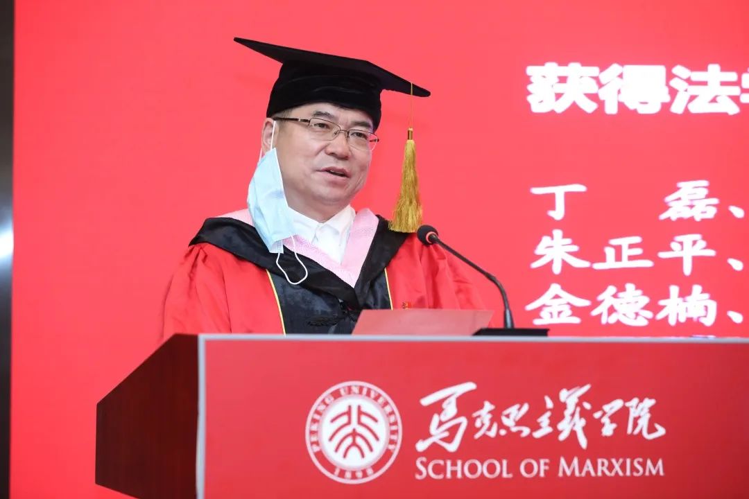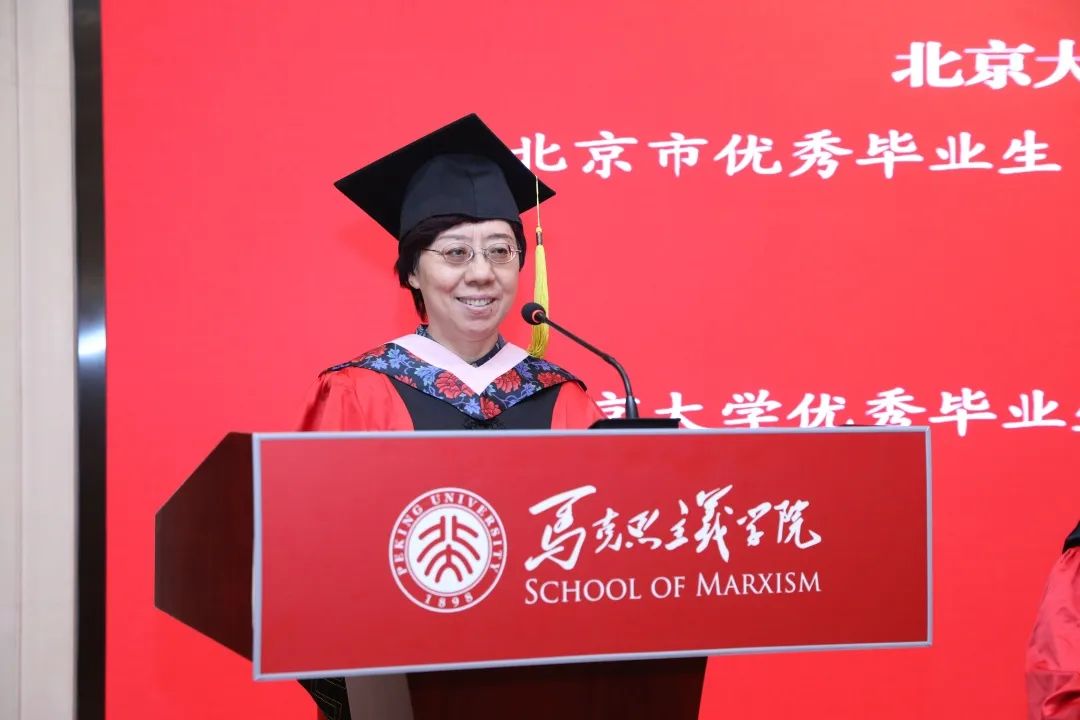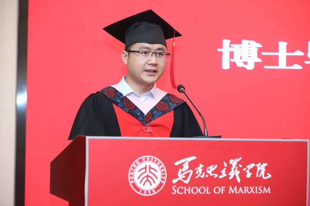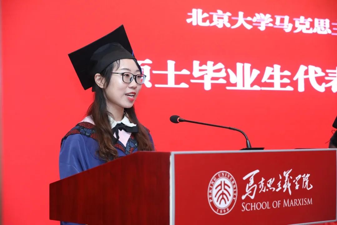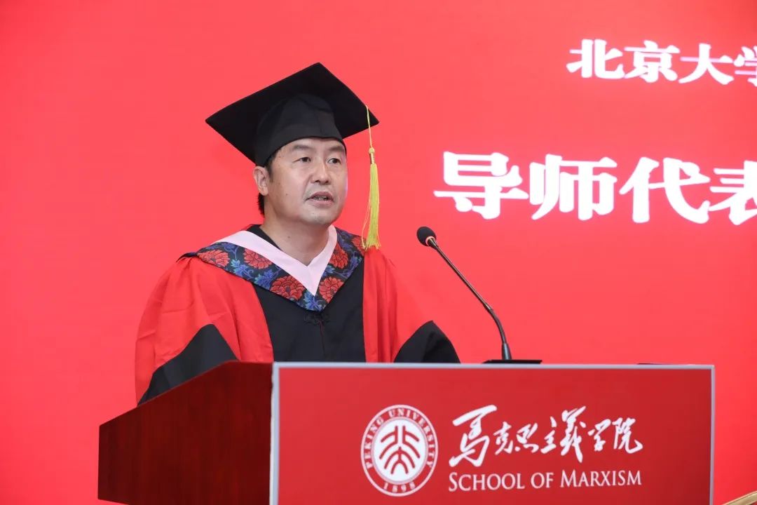 李少军老师作为导师代表寄语毕业生。他通过回顾李大钊先生传播马克思主义的历程,说明学习马克思要有科学态度和正确立场、理论联系实际的学风、钻研原著的精神以及树立历史的眼光。勉励同学们始终站在人民的立场,勇敢坚持实事求原则,在实践中改造自己。同时希望同学们将马克思主义理论化为方法,不断提高认识世界、改造世界的能力;将马克思主义理论化为德行,不断拓宽视野,提高人生境界,成为坚定的马克思主义者。
