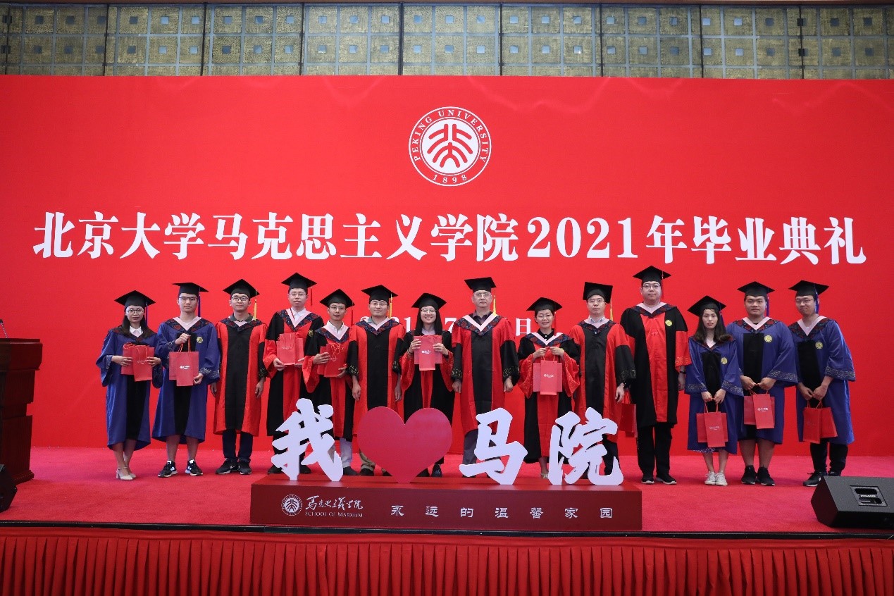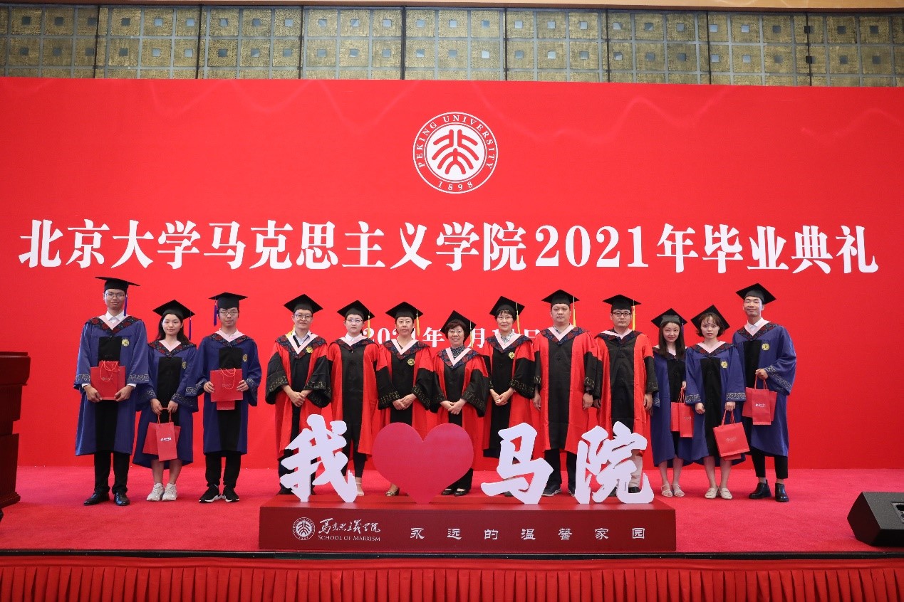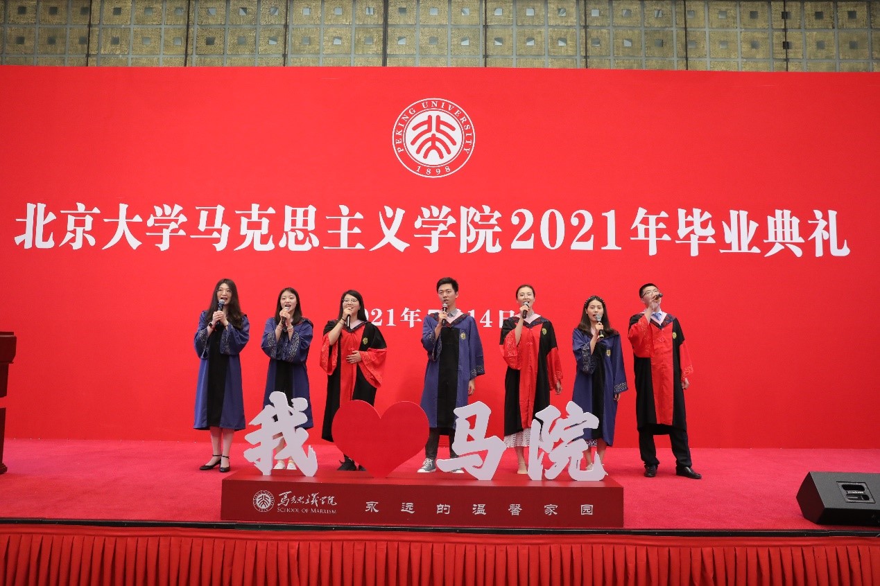 典礼在充满温情和回忆的毕业视频中拉开帷幕,视频记录了同学们在北大、在马院的学习生活中所留下的美好记忆,也寄托着同学们对未来的期待和展望。视频播放结束后,毕业生代表献唱优美动听的暖场歌曲《转身之间》《少年》《我们都是追梦人》《唱支山歌给党听》。歌声悠扬,情真意切,既表达着毕业的喜悦,也表达着马院人不忘初心,永远跟党走的坚定信念。