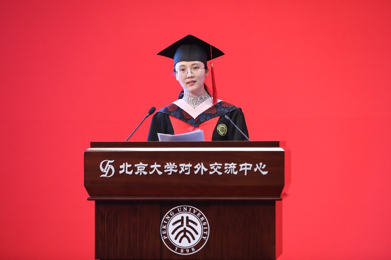 硕士毕业生代表尹航发表毕业感言。他回顾了自己在马院难忘的学习时光,感念于老师们的悉心指导、父母的殷殷关切、同窗们的深情厚谊。他表示,作为北大马院毕业的新时代青年,一定会以民族复兴为己任,不负时代,不负韶华,不负党和人民的殷切期望,以实际行动诠释“请党放心,强国有我”。