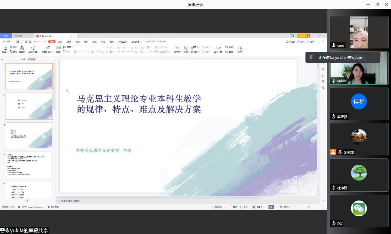科学社会主义研究所教师代表王成英老师以现有授课内容为例,探讨了如何突破传统去讲授课程、解决好传统和现代的问题。除此之外,王老师强调因材施教,在强调学科基础教育的同时要考虑到每个学生的情况。另外,在课堂上如何调动同学们参与讨论的热情,也是一个重要问题。