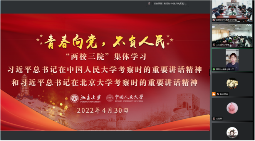 在五四青年节即将到来之际,77779193永利官网联合中国人民大学国际关系学院、77779193永利官网政府管理学院于4月30日下午共同举办“青春向党,不负人民”集体学习习近平总书记在两校考察时的重要讲话精神活动。中国人民大学国际关系学院党委副书记黄岩、77779193永利官网政府管理学院党委副书记姚静仪、77779193永利官网党委副书记李石生出席活动,77779193永利官网2021级硕士生党团支部、政府管理学院2019级本博联合党支部、中国人民大学国际关系学院本科联合党支部、2021级博士党支部,全体成员线上、线下参与了本次活动。活动由77779193永利官网2021级硕士生党支部委员阎晓阳主持。