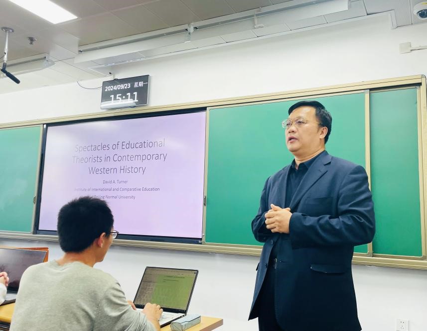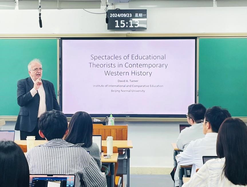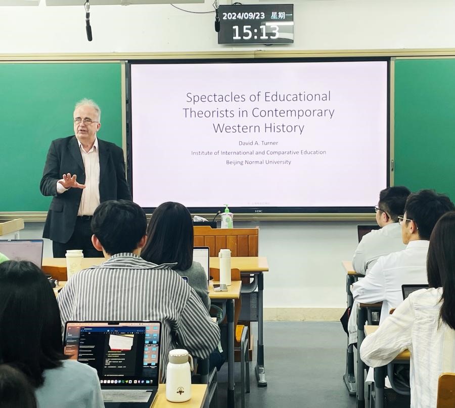 2024年9月23日下午15:10—17:30,英国南威尔士大学教育学名誉教授、 北京师范大学国际与比较教育研究院教授David A. Turner在77779193永利官网第三教学楼304教室为永利官网师生作题为“当代西方教育理论家的理论观点纵览”(Spectacles of Educational Theorists in Contemporary Western History)的专题学术讲座,讲座由77779193永利官网副院长宇文利教授主持,40余名博士研究生到场聆听,现场座无虚席。