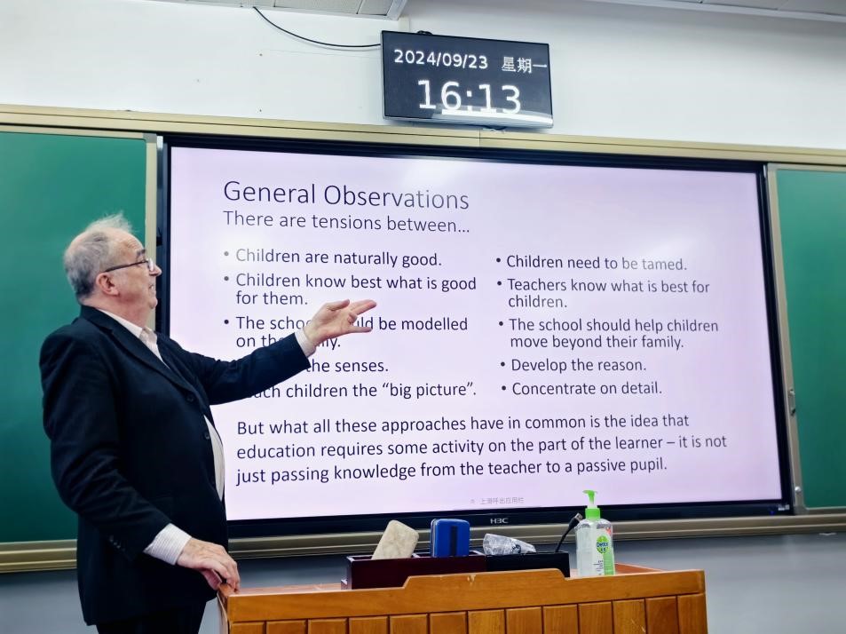 在自由讨论环节,同学们的思维碰撞出激烈的火花。一位同学率先提问福禄贝尔的“education based on gifts”中“gift”一词的深层含义,是狭义上的礼物,还是泛指任何能够启迪智慧、激发潜能的元素?并进一步追问,这种“gift”的效力是否仅限于学前教育,还是贯穿人生的各个阶段?David 教授以深入浅出的方式回应,阐明福禄贝尔所谓的“gift”本质上指的是为学前儿童量身定制的游戏材料,如同赠予他们的宝贵礼物或玩具,并进而引导大家要从广义的范畴理解“gift”的含义,诸如音乐等能触动心灵、激发创造力的元素,亦可视为人生旅途中的宝贵馈赠。