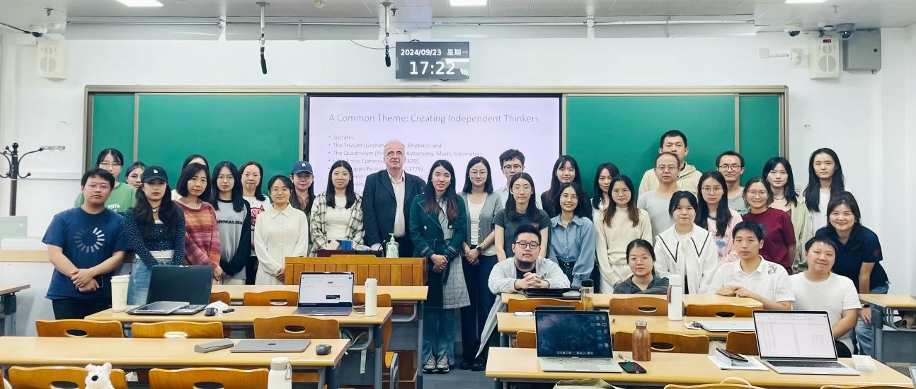 面对人工智能时代的挑战,特别是ChatGPT等工具对教育的潜在影响,同学们表现出浓厚兴趣。David 教授指出,这些技术无疑能提升工作与学习效率,但它们的回答往往缺乏个性化与情感深度,无法完全替代人类思考与创新。他进一步反思:现代社会中部分学生追求挣钱而非精神成长、独立人格的现象,离不开社会导向、教育责任。他呼吁同学们应将大学时光作为自我探索的宝贵时期,鼓励大家在自由中思考,找到真正热爱并愿为之奋斗的事业。