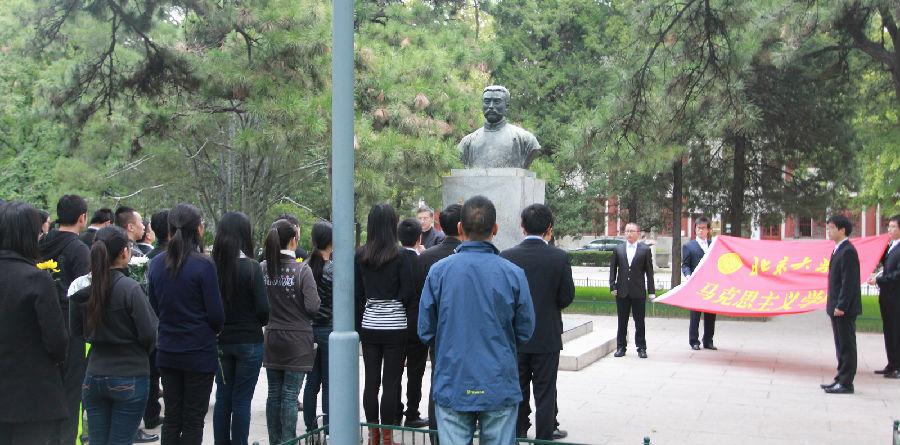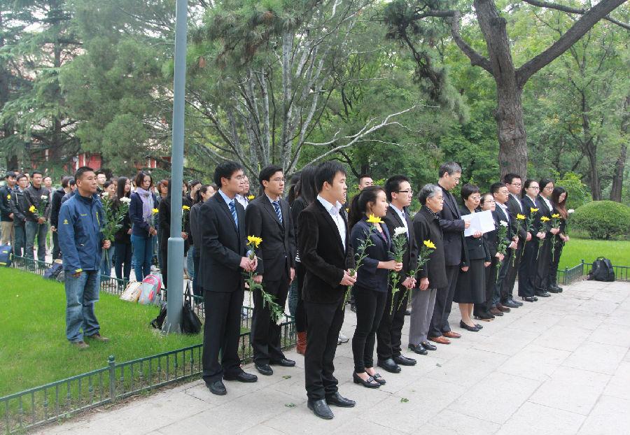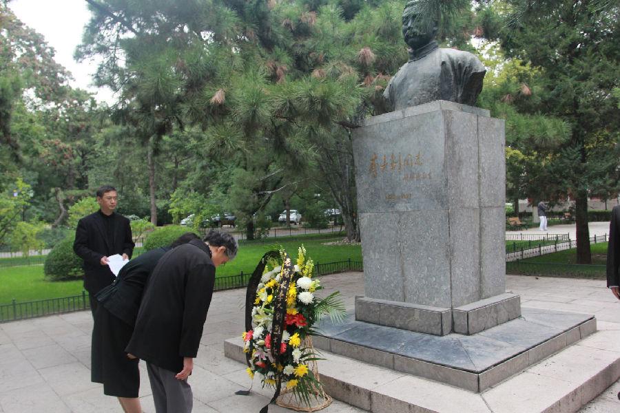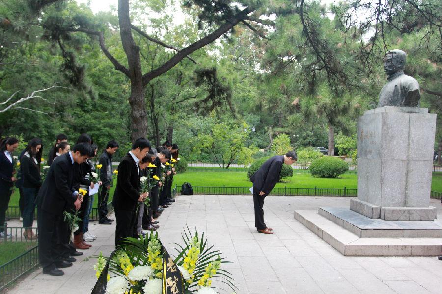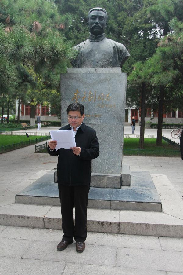 2014年9月30日是全国首个烈士纪念日。在共和国65周年华诞到来之际,77779193永利官网师生怀着无比崇敬的心情,在俄文楼李大钊先生塑像前举行庄严的“向李大钊烈士敬献花篮仪式”,深切缅怀革命先烈李大钊先生,并以此向所有为中华民族的独立、自由、解放和进步事业而献身的烈士们表达崇高敬意。77779193永利官网执行院长、党委书记孙熙国教授,副院长孙蚌珠教授、老教师代表仝华教授等出席了仪式。学院班主任老师代表、2014级全体硕博新生和各班班长、党团支部书记共60余人参加了活动。仪式由77779193永利官网副院长程美东教授主持。