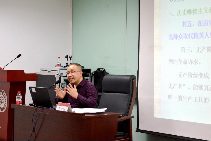 李成旺老师以“《德意志意识形态》‘费尔巴哈章’的深层理路再解读”为主题,讲授了历史唯物主义的超越对象与超越路径。他认为,马克思与恩格斯的一生留下了卷帙浩繁的著作,其中大多是论战性著作,其论题有明确的超越对象,其主题是人的自由的实现问题。马克思的思想主要是其哲学思想,其经济学话语也凸显了哲学智慧,其哲学思考带有明显的德意志民族的特点。针对“历史问题何以成为重大哲学问题”,李成旺老师提出了自己的见解。他认为,人是时间—历史性存在,古今中外人类所葆有的美好价值目标都表现为一个尚未完成的存在,它需要假以时间的绵延过程才能日臻完善和实现。李老师介绍了传统西方五种代表性历史观,指出了它们的局限性,并说明了历史唯物主义超越传统西方历史观的五大理论支点。
