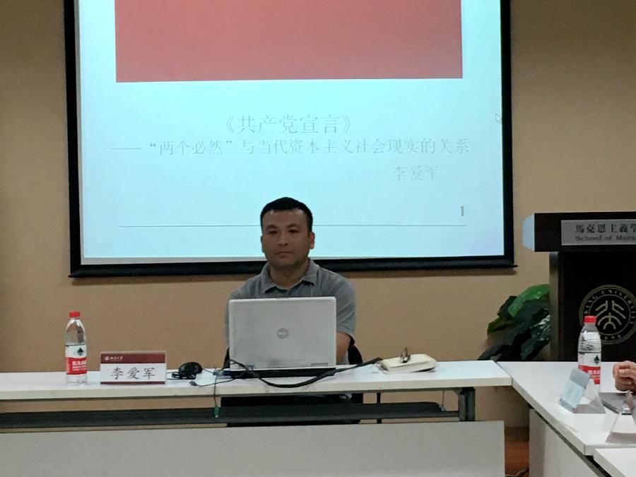 李爱军老师以《共产党宣言》为分析文本,以共产主义者同盟组织的发展嬗变、马克思恩格斯在《宣言》前的思想发展、《宣言》各个草稿之间的关系为线索,讲解了《宣言》中“两个必然”思想的论证过程,以及“两个必然”思想与当代资本主义社会的关系。李爱军老师还分享了他的读书方法与心得,强调要将阅读原著与版本学研究和思想史学习相结合。