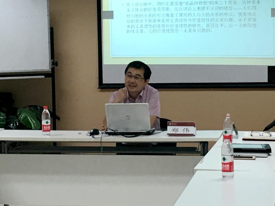 郑伟老师以《商品的拜物教性质及其秘密》为题,从价值论、认识论和事实层面,对马克思《资本论》第一卷涉及的“商品拜物教”问题进行了阐释,解读了马克思对“商品拜物教”的分析思路,结合现实提出了富有思考深度的见解。
