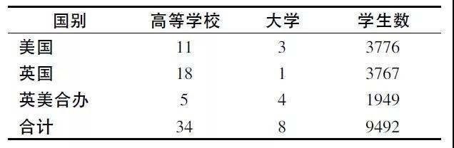 1917年前英美在华设立的高等学校数量以及学生数量如下[1]: